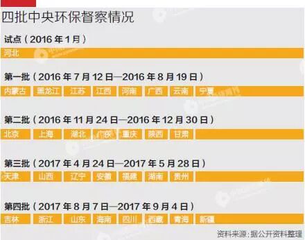 中央环保督察2016年1月在河北开展试点,至2017年8月,第四批中央环保督察已完成进驻四川、吉林等8省份。至此,从2016年到2017年两年的时间,中央环保督察完成了对全国所有省份的覆盖。