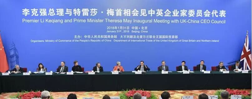1月31日,国务院总理李克强在北京人民大会堂与英国首相特雷莎·梅同出席中英企业家委员会成立大会暨第一次会议的企业家代表举行座谈。