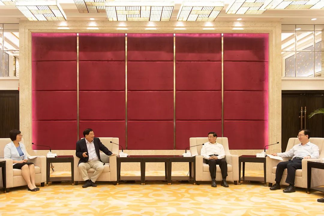 2020年9月2日,曹德旺向闽鄂黔捐赠14亿元用于扶贫、救灾、医疗、教育等项目。图为福建省委书记于伟国(右二),福建省委副书记、代省长王宁(右一),湖北省人大常委会党组书记、常务副主任王玲(左一)与曹德旺董事长(左二)一行座谈。