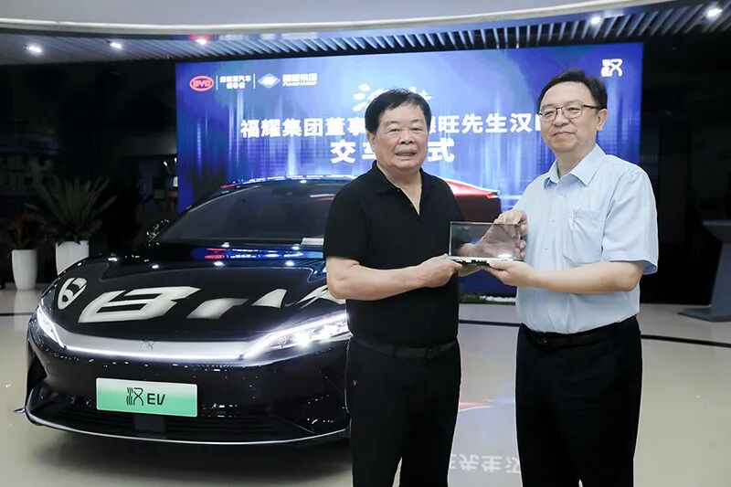 2020年9月20日比亚迪集团董事长兼总裁王传福(右)亲手将一辆玄空黑色的四驱高性能版旗舰型汉EV交予福耀集团董事长曹德旺(左)。