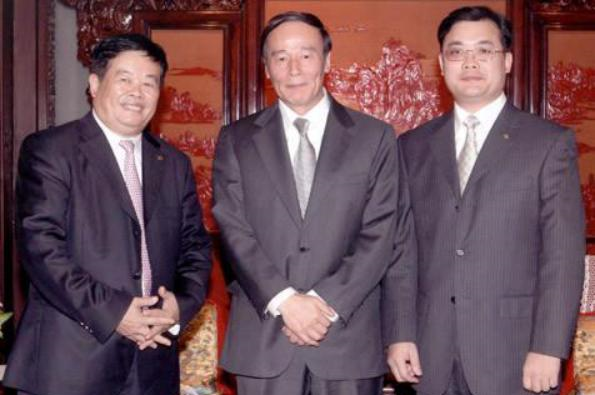 福耀玻璃集团创始人、董事长曹德旺(左)和大儿子曹晖(右)与国家副主席王岐山(中)合影